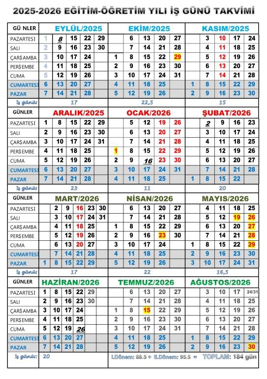 2025-2026 YILI ÇALIŞMA TAKVİMİMİZ